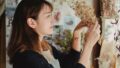 Close-up portrait of a woman with long, flowing blonde hair against a textured background. バズ