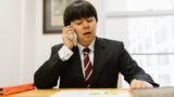 Confident businessman in black suit holding pink folder, smiling at the camera indoors. バズ